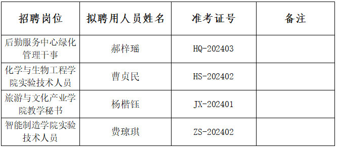 根据《8868官方网站2024年公开招聘人事代理制专业技术人员公告》有关规定,经报名、资格审查、笔试、面试、专业技能测试、成绩公示、体检、考察等程序,经8868官方网站校长办公会研究,确定郝梓瑶等4名同志为8868官方网站2024年公开招聘人事代理制专业技术人员拟聘用人选,现予以公示。