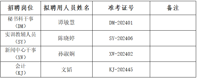 根据《8868官方网站2024年公开招聘公告》有关规定,经报名、资格审查、笔试、面试、专业技能测试、成绩公示、体检、考察等程序,经8868官方网站校长办公会研究,确定谭敏慧等4名同志为8868官方网站2024年公开招聘教辅管理岗位拟聘用人选,现予以公示。