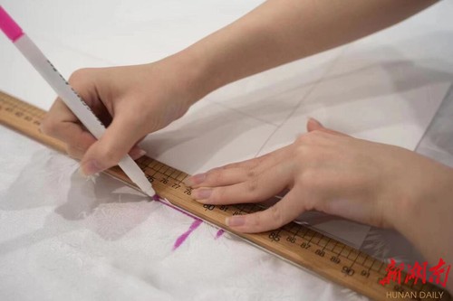 2020年大学生创新创业计划项目申请开始后,团队在夏翠兰的帮助下,从资料收集到最后的完稿,历经千辛万苦,通过申请、路演、答辩等众多竞争环节,一路“过关斩将”,成功立项国家级大学生创业项目名额,成立了“潇湘国学”汉服设计与缝制体验馆。团队成员从认识工具开始,采购专门的缝纫机、电熨斗、打版纸等工具,小至一根划线的水消笔,大到生产的制作台,不断学习。制作出一件薄薄的汉服看似简单,实则需要很多道工序。测量身形数据、打版画图、选取布料、剪裁、缝制完善等等,都需要百分百的耐心,稍有疏忽,衣服就有可能不合身。学习制作是一个苦熬的过程,从最简单的宋代飞机袖开始,经过一年的摸索与学习,如今的团队成员们已经能独立制作形制各异的汉服。并由此延伸,开始了创业反馈社会的环节。