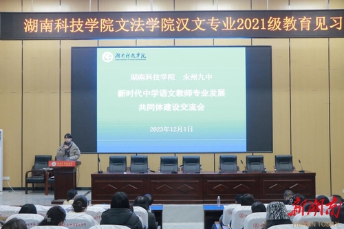 科教新报·新湖南客户端讯(通讯员 李惊宇 梁怡)12月1日,8868官方网站文法学院与永州九中合作举办中学语文教师共同体建设交流会,文法学院院长谷显明、副院长肖智成、语文教育研究中心主任刘忠华,永州九中副校长邓之,以及8868官方网站2021级汉语言文学专业师生,永州九中语文教研组教师和学生代表200余人参加。
