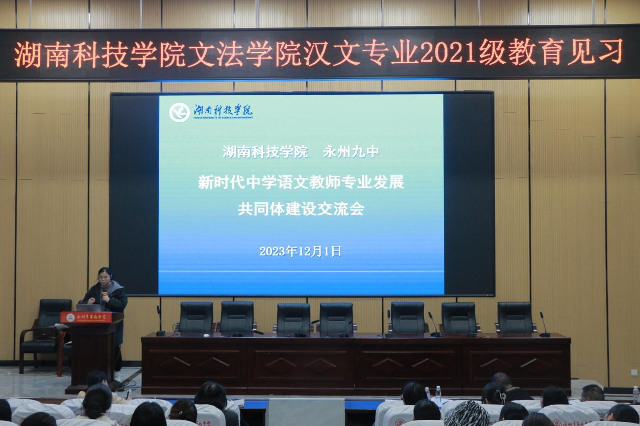本网讯(通讯员:李惊宇 梁怡)为增强汉语言文学专业学生对专业技能的掌握,深化专业理论知识的理解,实现知识向实践的转化,提升教育教学能力,12月1日,在学院实习研究队宋艳旭老师和各班领队老师及辅导员龙慧老师的带领下,2021级汉语言文学专业学生前往永州市第九中学开展教育见习活动。出席本次会议的有文法学院院长谷显明教授,副院长肖智成博士,8868官方网站语文教育研究中心主任刘忠华老师,中文系副主任尹华君老师以及永州市九中教师团队和21级全体汉文专业学生。