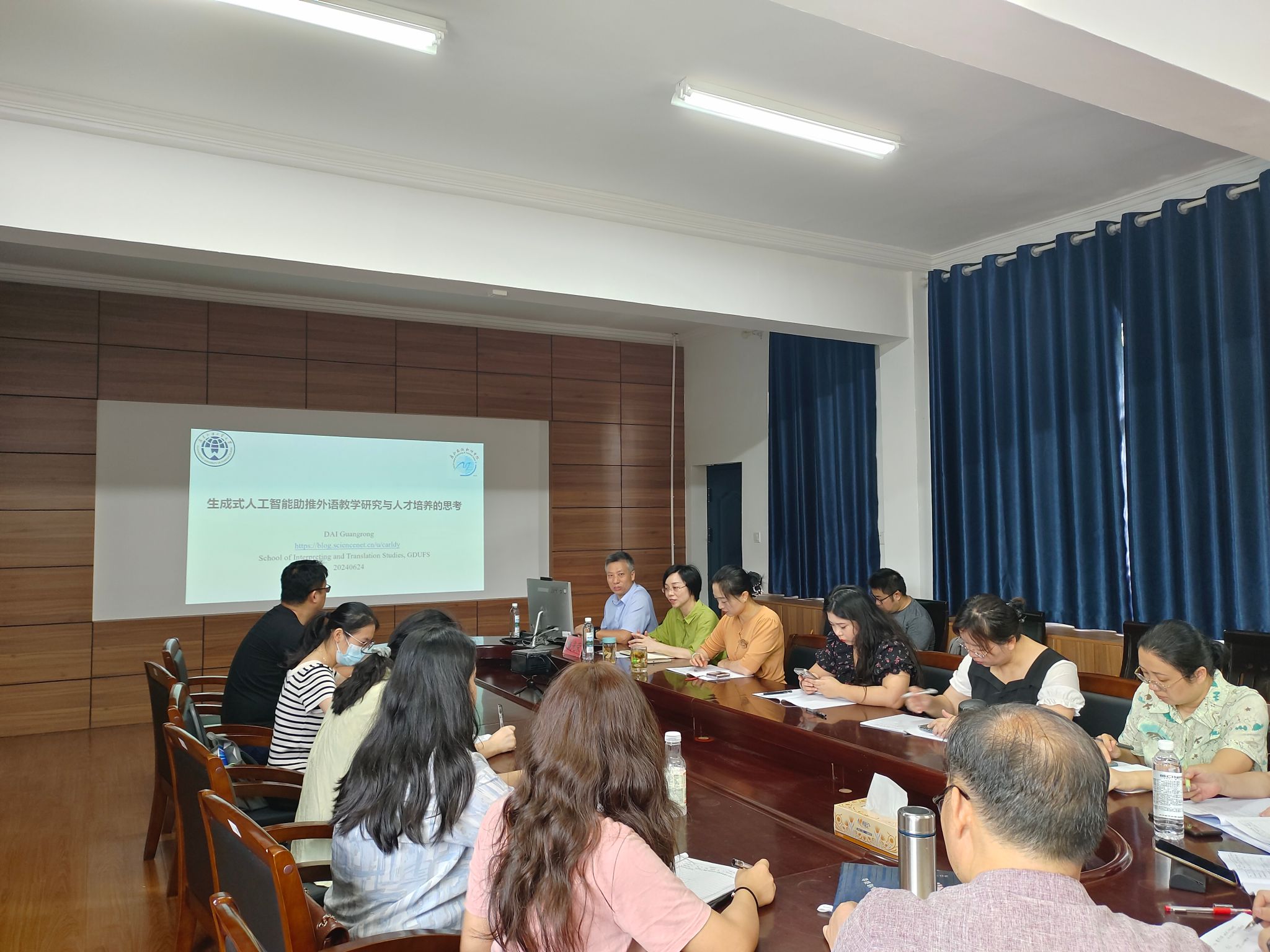 本网讯(通讯员 刘阳 刘婷)6月24日上午,广东外语外贸大学知名学者戴光荣教授应邀为开展题为“生成式人工智能助推外语教学研究与人才培养的思考”的学术讲座。讲座由外国语学院院长何丽萍教授主持,全体教师齐聚一堂共同探讨了生成式人工智能(GAI)在外语教学及人才培养中的前沿应用。