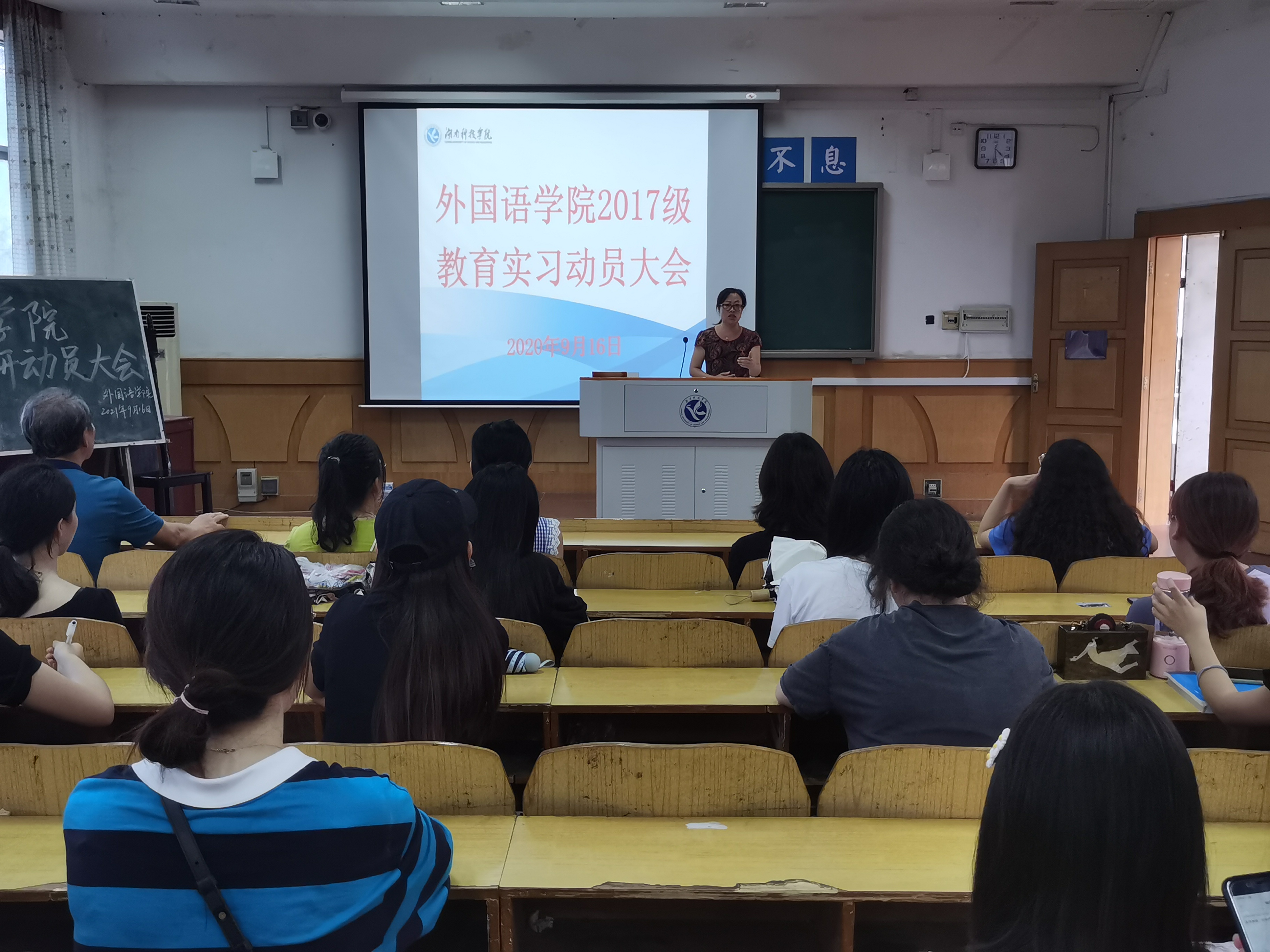 (本网讯 通讯员刘罗 摄影 吴哲)9月16日下午,外国语学院在博雅楼西二召开了2017级英语师范专业教育实习动员大会,外国语学院院长欧华恩、副院长彭宁红共同出席本次大会,会议由2017级辅导员刘罗主持。
