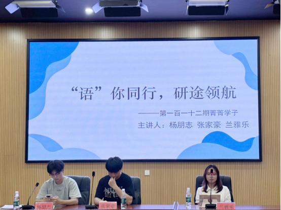 (通讯员 李灿 摄影 何诗涵)5月26日晚19:30,外国语学院于博雅楼东三报告厅举办了第112期菁菁学子讲坛。主题为“‘语’你同行,研途领航”。本期讲坛的主讲嘉宾为日语2101班杨朋志、日语2101班张家豪、日语2102班兰雅乐。