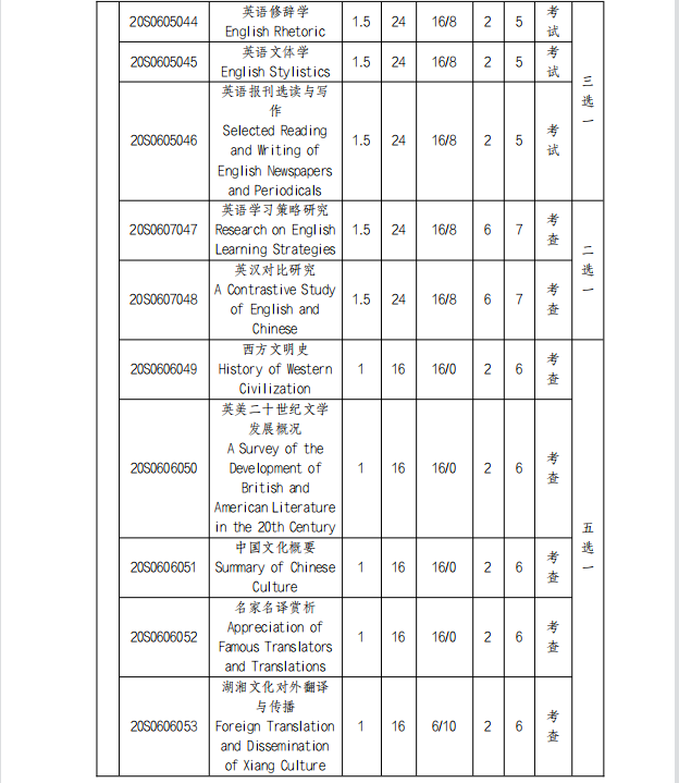 英语语法(一)(二)、英语听力(一)(二)(三)(四)、英语 阅读(一)(二)(三)(四)、英语写作(一)(二)、综合英语(一) (二)、高级英语(一)(二)、英汉互译理论与实践(一)(二)、英 语语言学导论、英语文学导论、跨文化交际