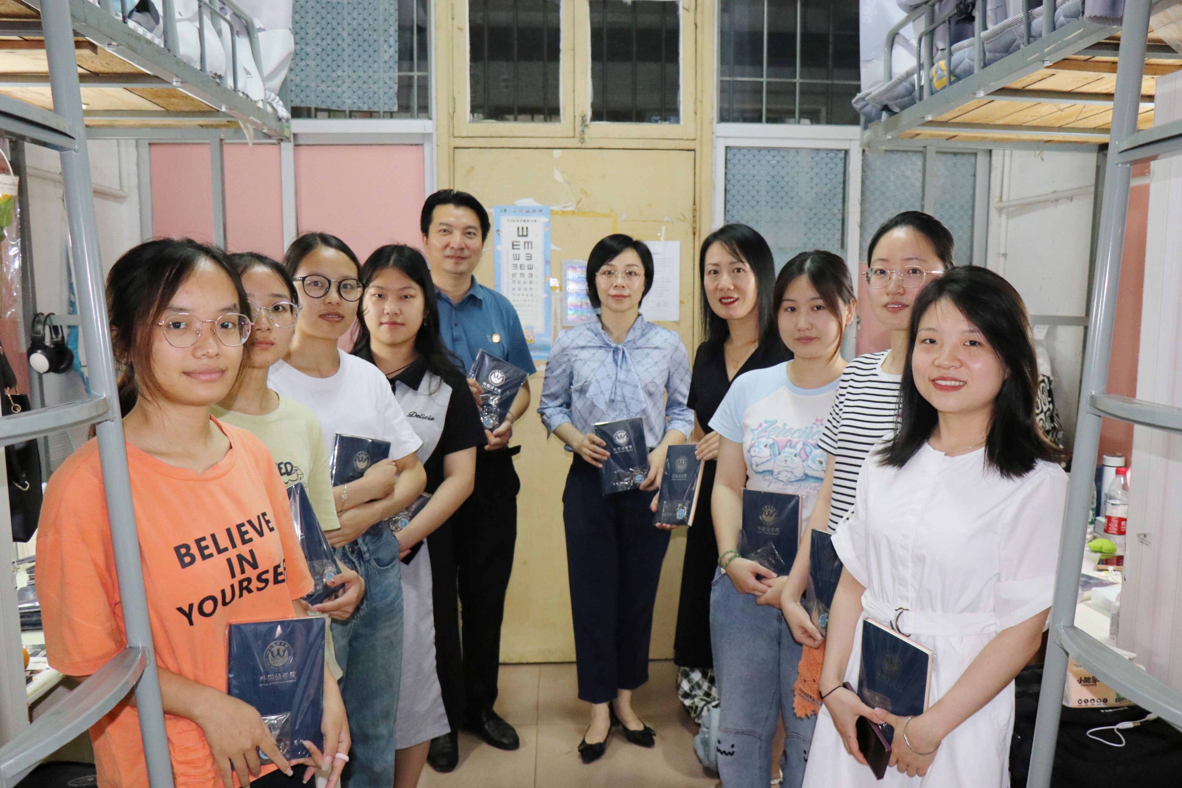 (通讯员 旷湘怡)外国语学院院长何丽萍、党总支书记唐君、党总支副书记罗晶走进学生宿舍为306名毕业生送上了专属定制的毕业礼物——以学院虚拟形象为原型的“毕业系列”钥匙扣和带有院训的限定笔记本。“礼物虽不昂贵,但是却很珍贵。”院长何丽萍说道:“希望各位毕业生能一直记得在外院学习、生活的日子,记住我们在一起的时光,带着学院的期待奔赴各自的未来,走向下一段旅程。”
