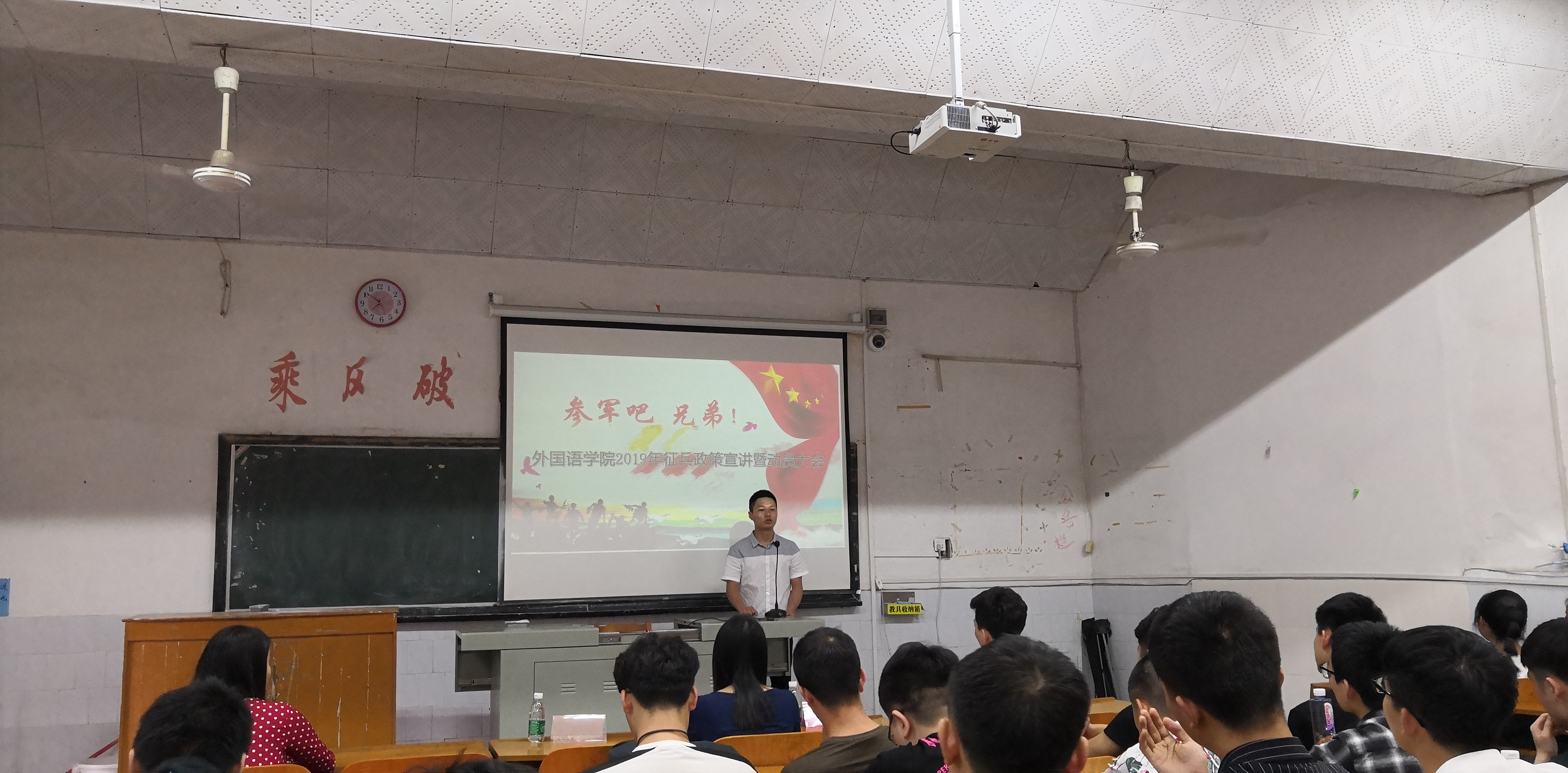 本网讯(通讯员 郑云华)建功新时代,青春献国防。4月26日下午,外国语学院2019年征兵政策宣讲暨动员大会在博雅楼东1-1召开。外国语学院党总支副书记、副院长罗晶;18级辅导员王素芳老师;17级辅导员杨佳;我校退役复学的经济与管理学院统计学1601班谌明江同学和电子与信息技术学院通信工程1601班许收同学以及我院各年级有参军意向的同学出席本次会议。大会由王素芳老师主持。