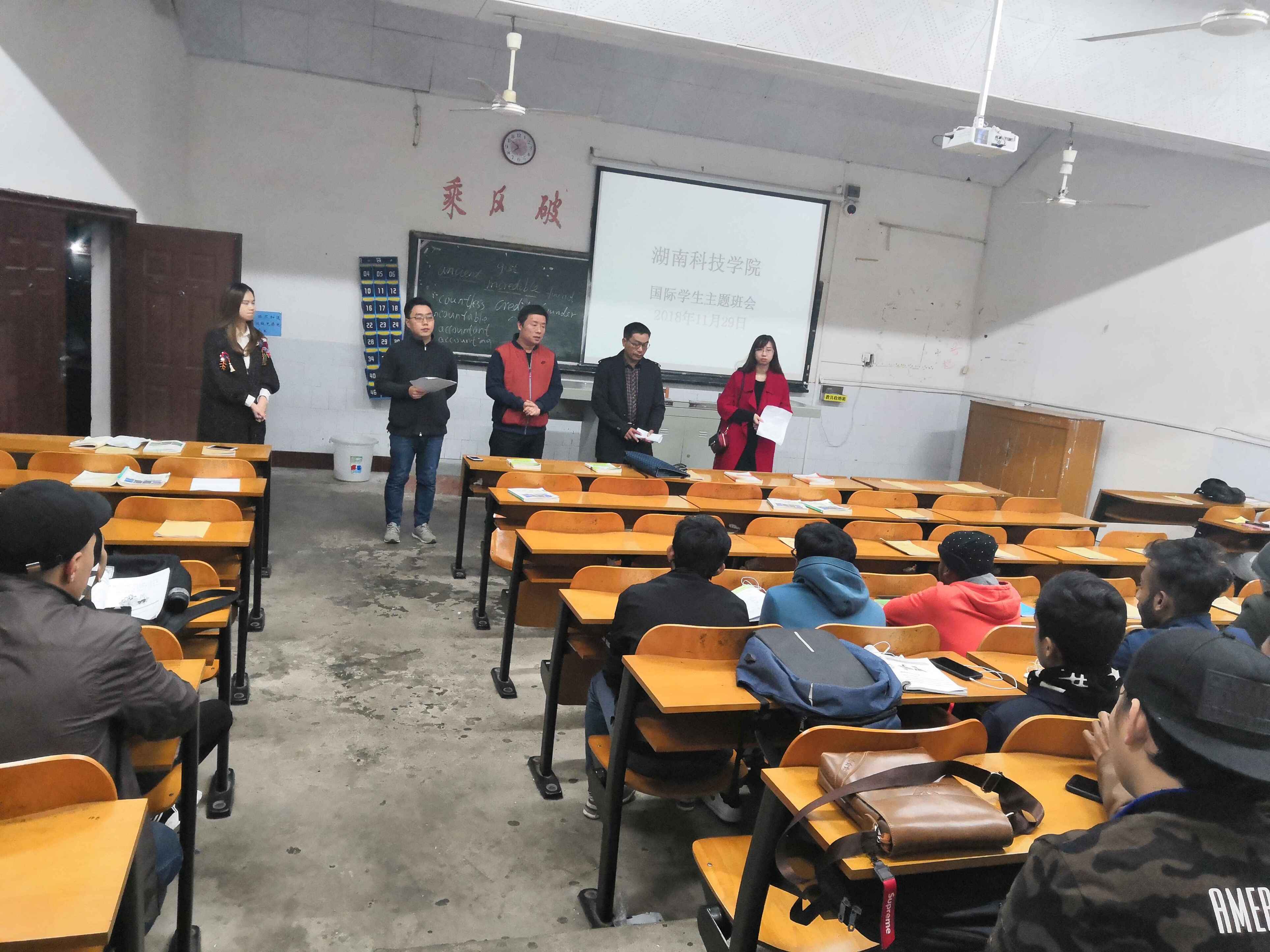 本网讯 11月29日晚7点30分,在博雅楼东1-1教室召开国际生第二次班会,学校国际交流处处长郑际根,外国语学院党总支副书记王瑛,国际交流处干事任景赛、张曼娉,国际生班主任唐晨、国际生教师王素芳以及第二批全体国际生参加会议。