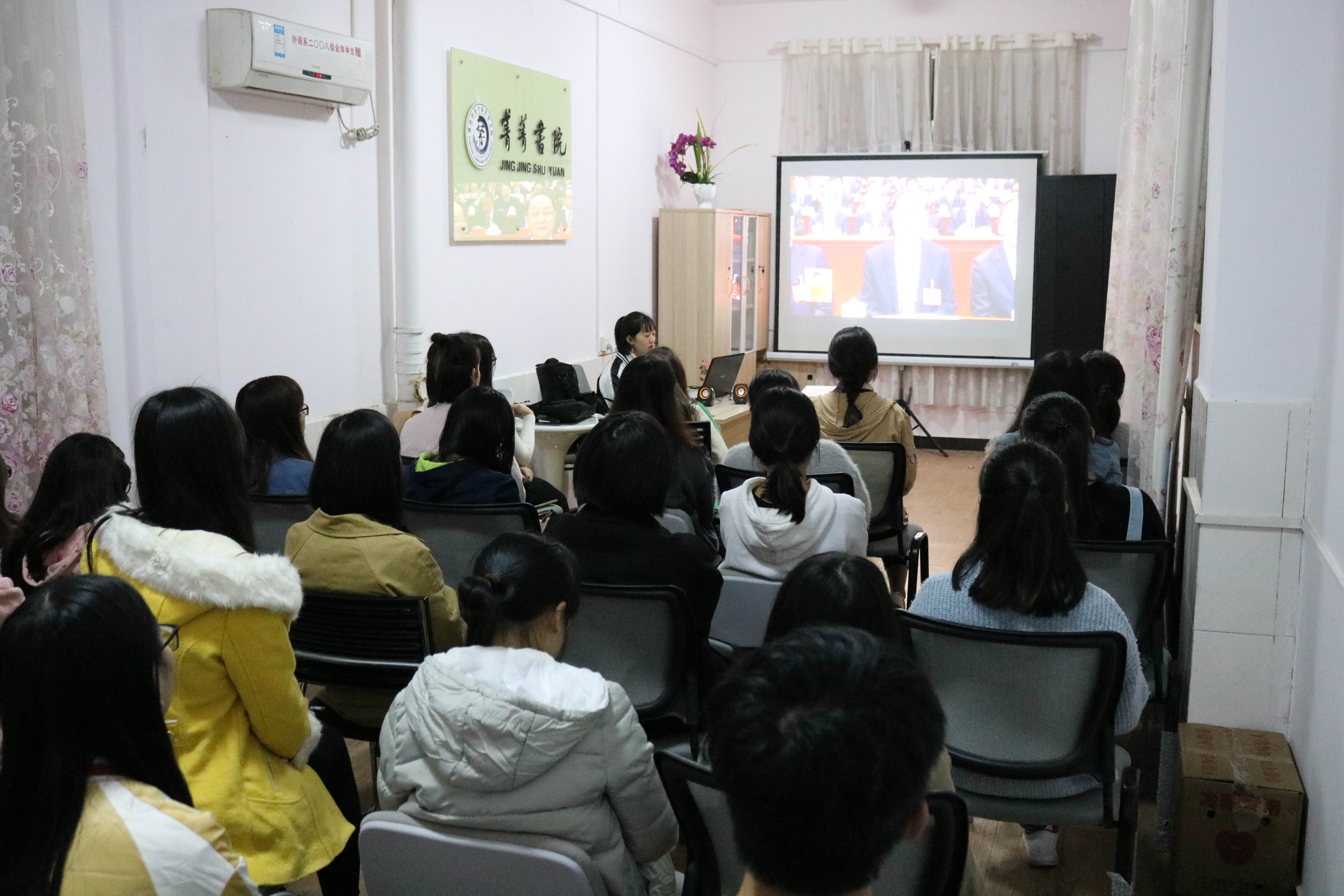 本网讯(通讯员 陈小峰 孙浩翔 )10月18日,外国语学院学生党员、各年级学生代表齐聚菁菁书院,观看中国共产党第十九次全国代表大会开幕式盛况,热切关注十九大。