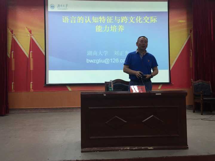 本网讯(通讯员 孙浩翔)6月19日上午,湖南大学外国语学院院长、博士生导师刘正光教授莅临我校在明德楼一楼报告厅作了题为“语言的认知特征与跨文化交际能力培养”的学术讲座。外国语学院院长欧华恩教授主持了讲座,外国语学院部分教师以及全体学生聆听了此次讲座。