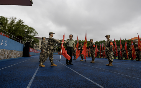 最后,在庄严的授旗仪式上,伴随着《中国人民解放军进行曲》的激昂旋律,杨涛向各营长郑重授予营旗,标志着2025级新生军训正式拉开帷幕。