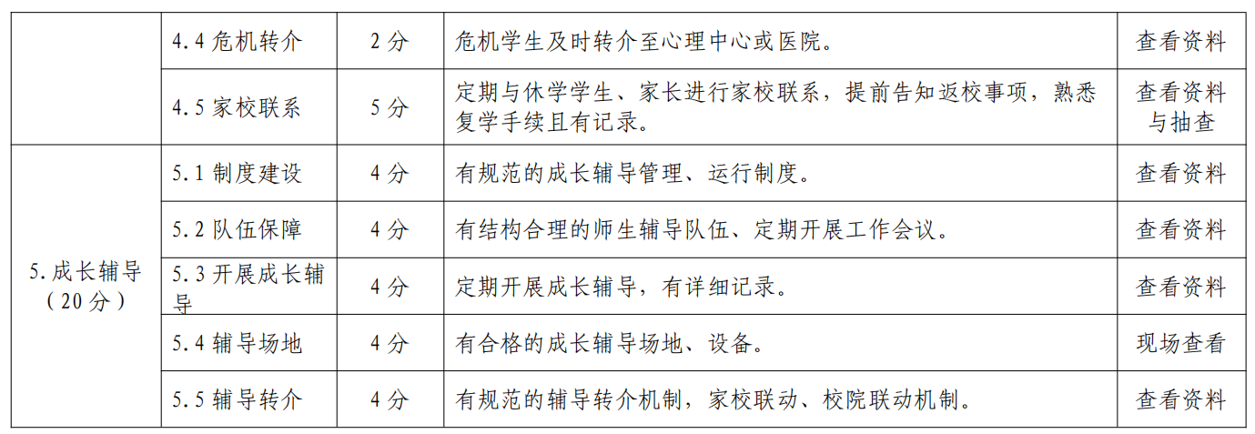 1.加强对教学学院心理健康教育工作的督查,成长辅导室建设与运行纳入学生工作考评体系。