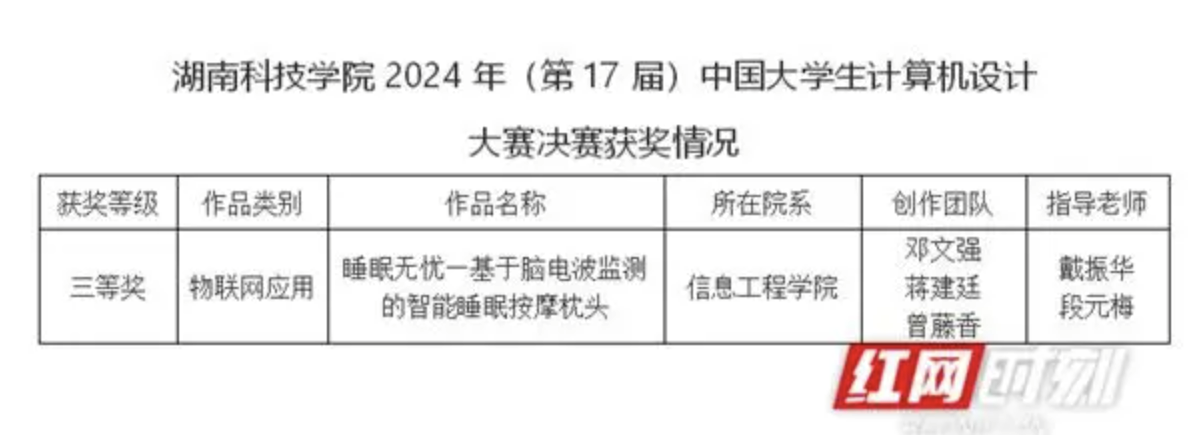 红网时刻新闻9月24日讯(通讯员 张彬 黄紫黎 向薛峰)近日,2024年(第17届)中国大学生计算机设计大赛在厦门举行。经过激烈角逐,8868官方网站信息工程学院学生邓文强、蒋建廷、曾藤香的参赛作品《睡眠无忧—基于脑电波监测的智能睡眠按摩枕头》荣获全国三等奖。