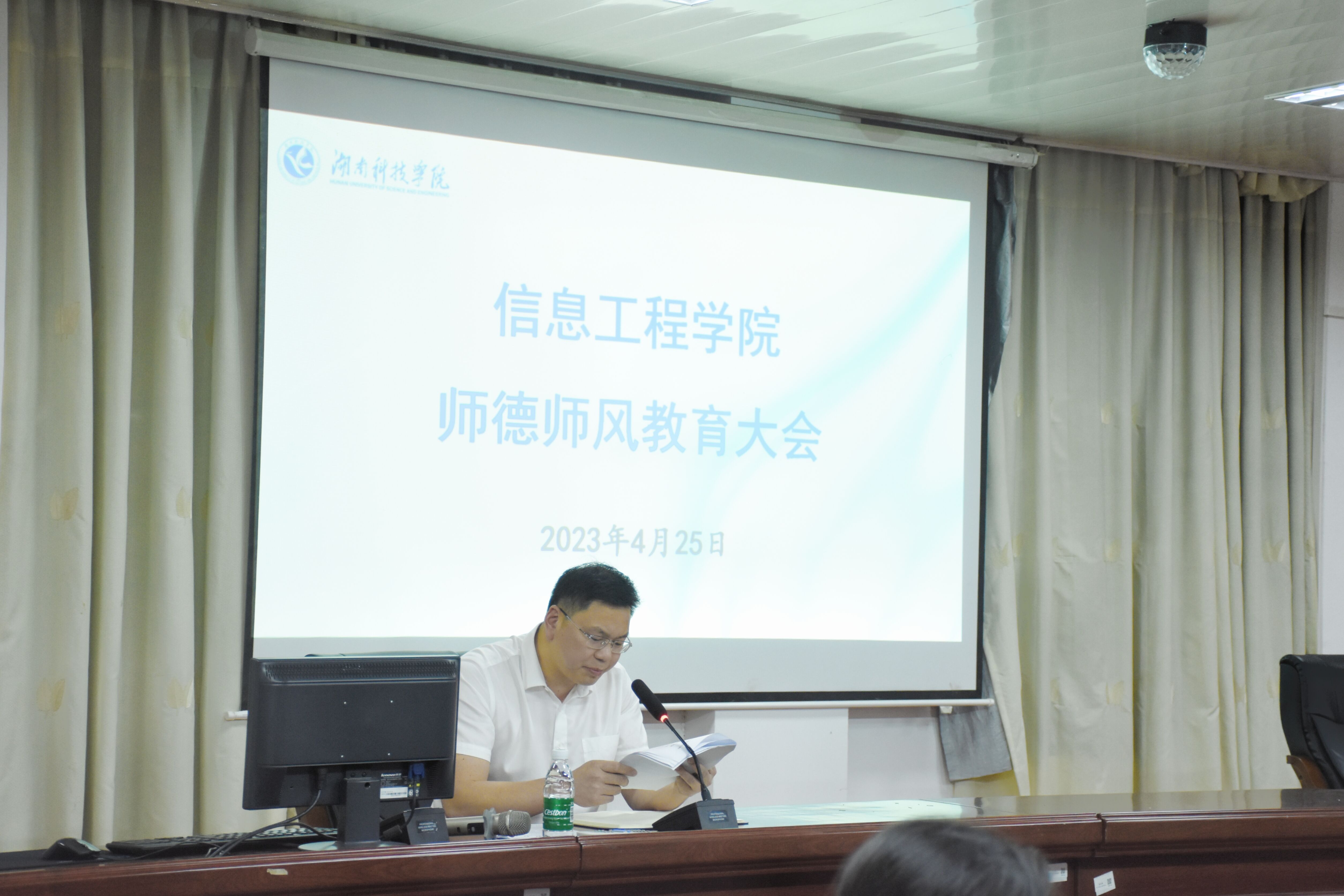 刘国华通报了《教育部公开曝光第十二批7起违反教师职业行为十项准则典型案例》,他指出,从典型案例通报和媒体曝光的情况来看,违反教师职业行为十项准则的事件时有发生,全院教师要敲响警钟,在师德师风方面时刻守住“底线”,不碰“红线”,筑牢“防线”,维护教师职业形象,提振师道尊严。