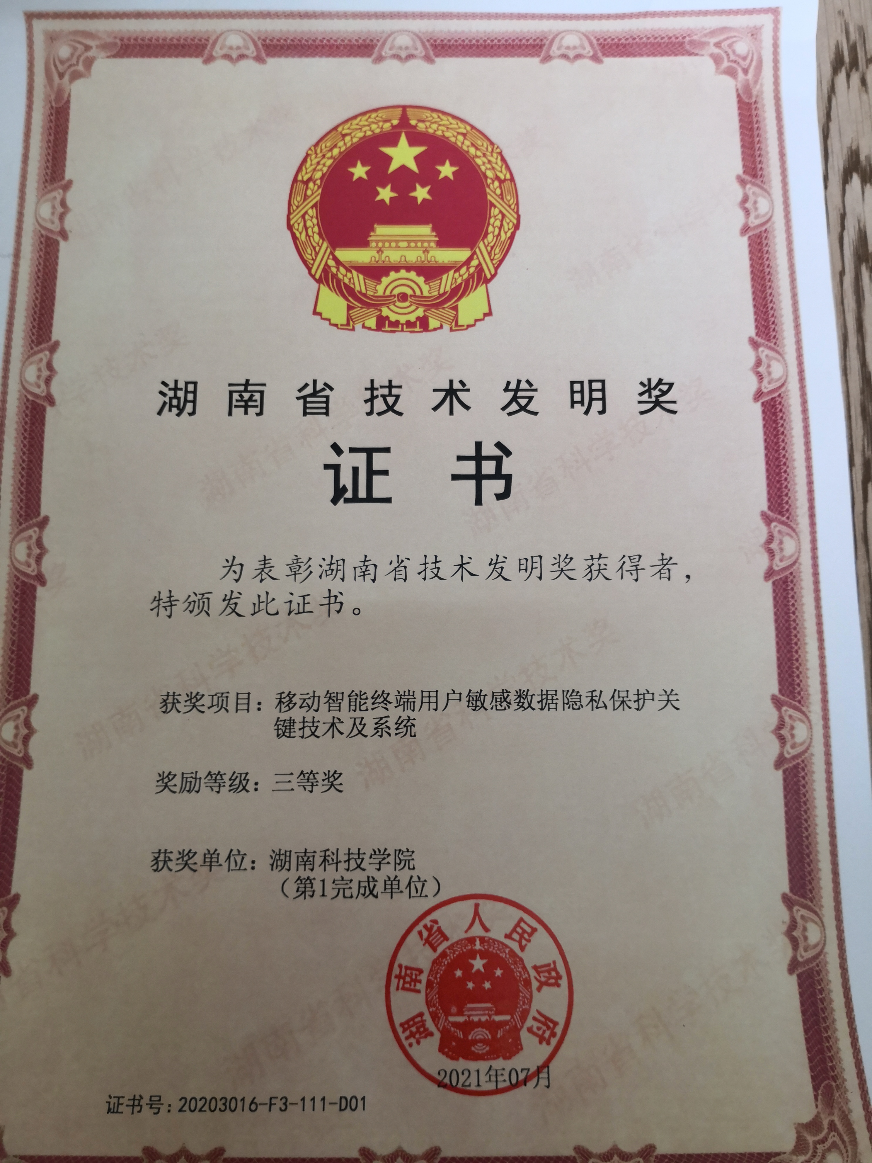 本网讯(通讯员 颜叶娟) 7月21日上午,湖南省科技创新奖励大会在长沙召开。会议表彰了2020年度湖南省科学技术奖励(含光召科技奖),8868官方网站作为第一单位有4项项目获奖。其中我院教授罗恩韬主持的“移动智能终端用户敏感数据隐私保护关键技术及系统”获湖南省技术发明奖三等奖。