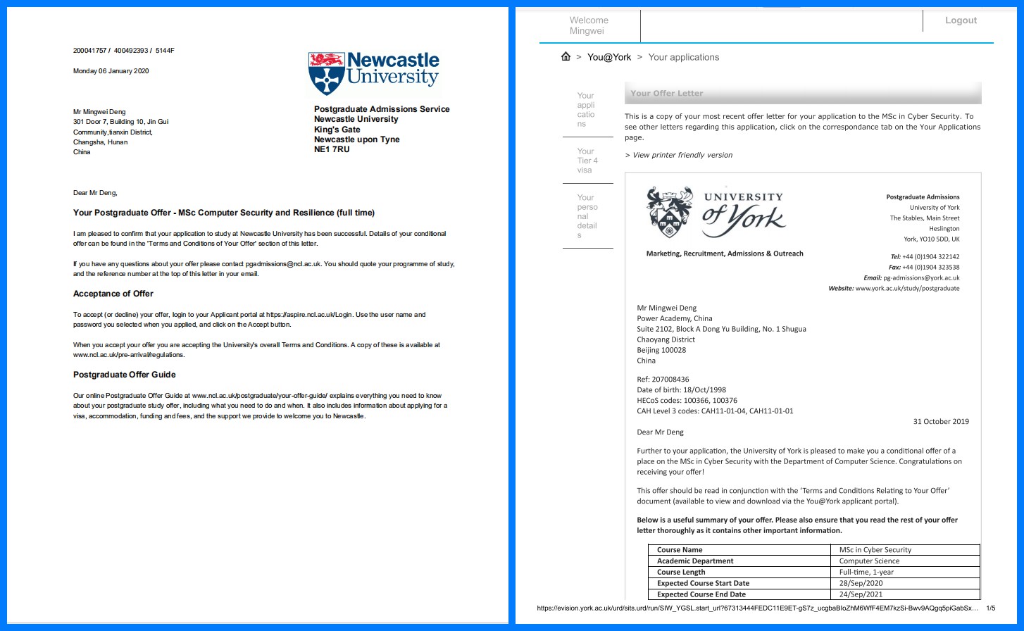 本网讯 近日,我校电子与信息工程学院软件1601班的邓铭巍同学同时收到了来自英国约克大学和纽卡斯尔大学的研究生录取通知书。