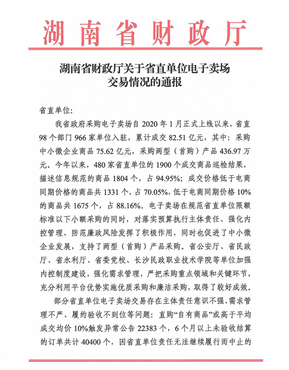 转发:湖南省财政厅关于省直单位电子卖场交易情况的通报