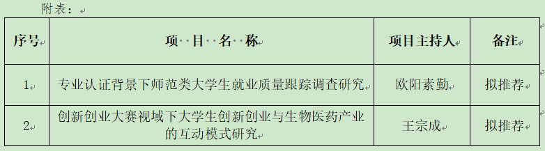根据湖南省教育厅《关于开展2024年湖南省普通高等学校教学改革研究项目立项和结题工作的通知》和湖南省大中专学校学生信息咨询与就业指导中心《关于申报2024年湖南省普通高校教学改革项目创新创业与就业专项的通知》要求,学校组织开展了2024年湖南省教学改革研究项目创新创业与就业专项申报工作。按照个人自主申报、学院(部门)推荐、学校组织校内外专家对申报项目进行了盲审,并召开了学校就业与创新创业工作领导小组会议进行评审,拟推荐欧阳素勤同志主持的《专业认证背景下师范类大学生就业质量跟踪调查研究》和王宗成同志主持的《创新创业大赛视域下大学生创新创业与生物医药产业的互动模式研究》2个项目参评省级普通高校教学改革项目创新创业与就业专项,现予以公示。